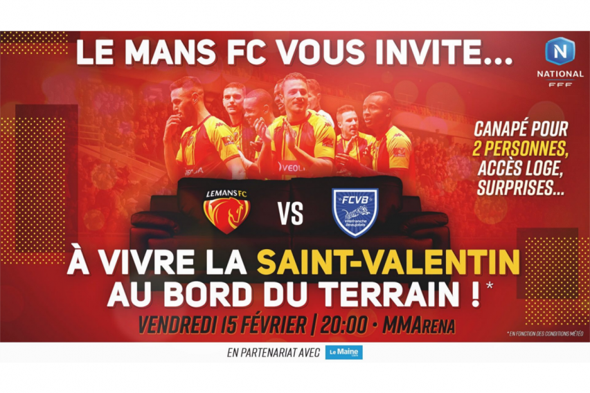 Pour la Saint-Valentin, LE MANS FC, en partenariat avec Le Maine Libre, vous invite, vous et votre moitié, à vivre un match des Sang et Or au bord du terrain du MMArena ! Le vendredi 15 février prochain (20h), assistez aux premières loges à la rencontre LE MANS FC-Villefranche de la 22e journée du National.
